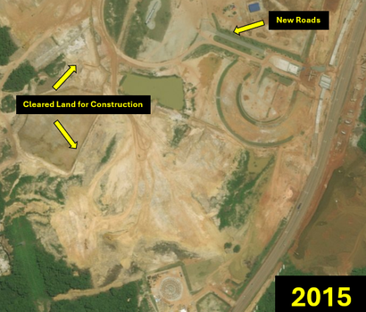 Imagery analysis from 2010 to 2014 (left to right) shows cleared land for construction, administrative buildings and concrete roads, and the addition of 12 crude oil storage tanks to accommodate increased supply (Figure 18-19).