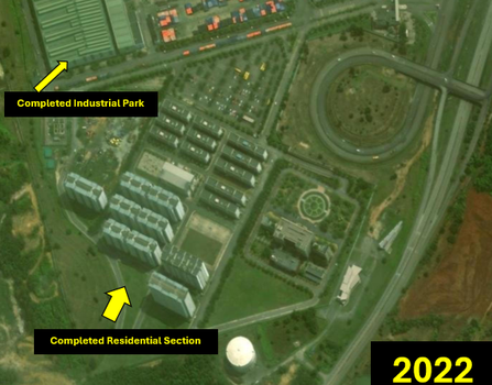 Like Myanmar’s KPSEZ, Malaysia’s MCKIP began construction prior to a formal BRI agreement. According to the official MCKIP website, MCKIP construction began in February 2013. It was placed under the umbrella of the BRI after China and Malaysia signed an MOU in May 2017 aiming to “promote joint economic development in the Silk Road and the 21st Century Maritime Silk Road,” according to a report from the Malaysian Investment Development Authority. China and Malaysia officially announced the MCKIP project in 2019. Unlike the Myanmar’s industrial park and high-end housing, Malaysia’s MCKIP has experienced consistent development since 2013. A comparison of satellite imagery from February 2011 to August 2022, shows steady development of the high-end housing section of the MCKIP 1 industrial park. The 2014 image shows survey sites and cleared land for construction vehicle access. The 2017 image shows all the vegetation cleared in preparation to pave roads, and foundations for a water tank. The 2018 image shows a significant jump in development with construction of small-scale apartment complexes and a parking lot for the residents. The 2023 image shows near-completion of the apartment block and the south end of manufacturing facilities identified by green roofing (Figure 10-13).