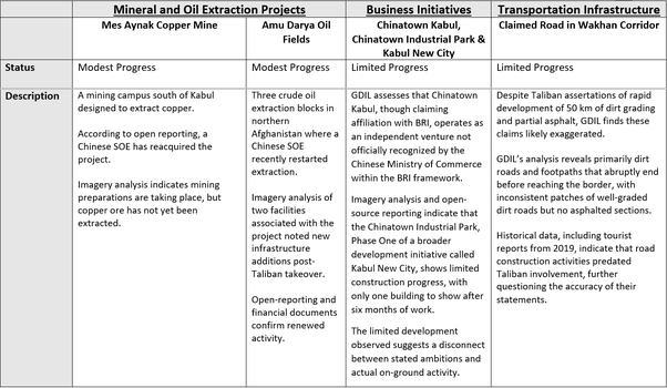This report evaluates the progress of five commercial projects central to Sino-Taliban economic cooperation. GDIL finds modest progress in Chinese-backed mining and oil projects and limited progress in industrial and road projects.