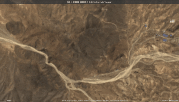 Despite the declared pause from cultural heritage, imagery analysis showed a revival in general activity on site starting in August 2023. Figure 6 is a timelapse showing the excavation of the hillside west of the main campus from August to October 2023. Figure 7 from February 2024 shows snaking dirt trails were dug out of the hill face, leading to open areas with parked cars and small sheds.