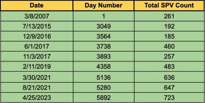 Fig. 1: This 3-column table displays the total SPV count over 9 separate counting days. The dates in the leftmost column were converted to set the first counting day as day 1. This conversion helps us to visualize the time between each of the counting days to more accurately visualize, to scale, the change in SPV numbers over 16 years.