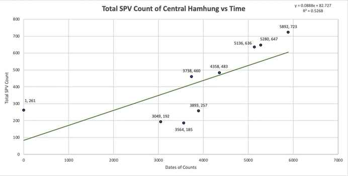 Fig. 2: The above plot displays the growth in total counts of SPVs over 16 years in Hamhung where dates are defined as day numbers. Using Google Earth Pro software, tallies of SPV counts in the defined border of central Hamhung were generated and plotted. Then, performing a simple linear regression in Microsoft Excel, we determined the equation for our line of best fit and its R² value.